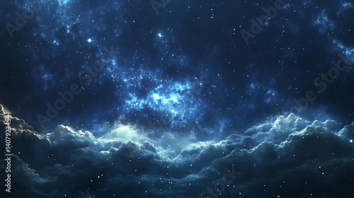 © Saira-stock, Naklejka premium A view of a night sky with clouds and stars shining brightly in the dark blue and black background