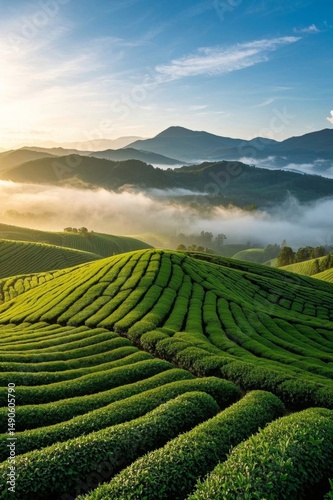 © haiqiang, Obraz premium a view of a tea plantation in the mountains with fog
