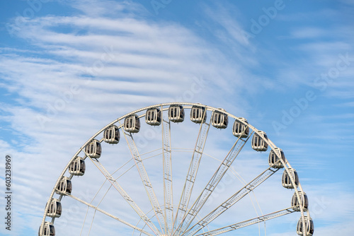 © bbaser78, Fototapeta premium A view of a the top half of a Ferris Wheel against to cloudy sky.