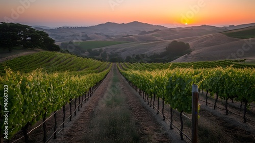 Naklejka premium 106. **A view of a vineyard with rolling hills and a sunset in the background.