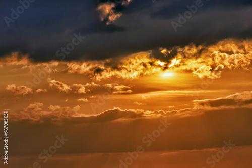 © fotosenukas, Fototapeta premium A view of a warm sunset illuminating the stormy clouds at dusk with vivid colors