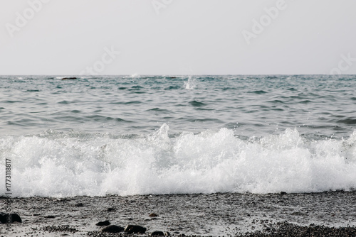 © Nataliya, Fototapeta premium A view of a wave rolling into the ocean on a black volcanic beach.