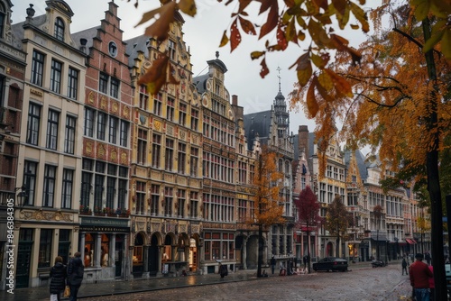Naklejka premium A view of classic European buildings with colorful facades during the fall season, with people and cobblestone streets