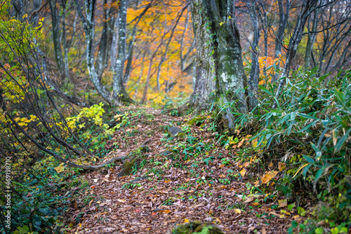 Fototapeta premium 入善町、黒部宇奈月温泉や白馬岳を眺められる富山県入善町の負釣山を紅葉の時期に登山する風景 A view of climbing Mt.Oiturushiyama in Nyuzen-cho, Toyama Prefecture, with views of Kurobe Unazuki Onsen and Mt.Shirouma-dake, during the season of autumn