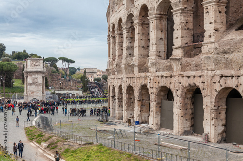 Fototapeta premium a view of Colosseum in Rome with trees on a sunny summer day and tourist