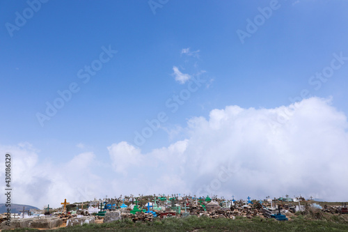Fototapeta premium A view of Crosses above graves at a cemetery in a village.