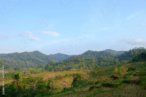 Fototapeta premium a view of dry rice fields during the dry season and very blue clouds