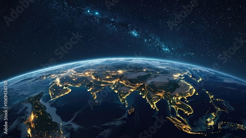 Obraz premium A view of Earth at night, highlighting Asia's illuminated cities.