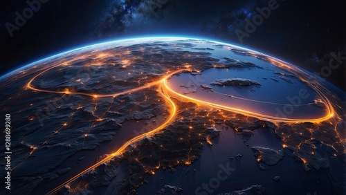 © Sadia, Obraz premium A view of Earth from space at night with illuminated cities connected by bright orange lines representing data connections and network activity.