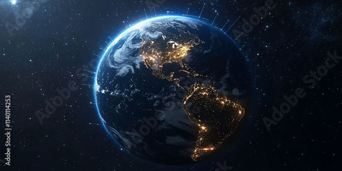 Obraz premium A view of Earth illuminated at night from space.