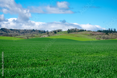 © Jennifer L Morrow, Obraz premium A view of farming fields layered over hills under a bright blue sky with fluffy white clouds