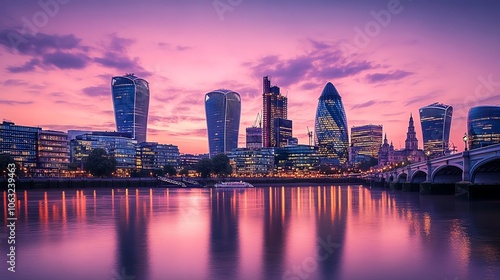 © Morning, Fototapeta premium A view of London's skyline at dusk, with the Shard in the center.