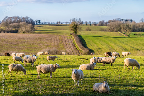 © Nicola, Fototapeta premium A view of sheep in the fields around Gumley, UK in Springtime