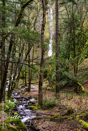 Obraz premium A view of Starvation Creek and Starvation Creek Waterfall shot from a distance. Shows path to the viewing area. Columbia River Gorge.