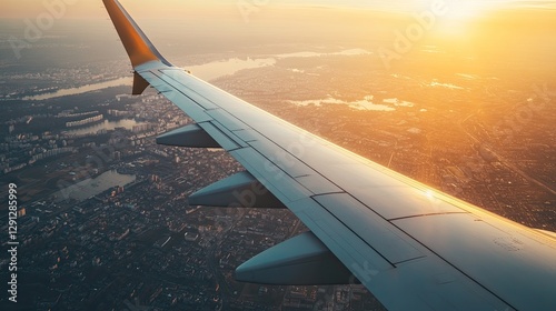 Fototapeta premium A view of the airplane wing during flight, with sunlight casting a warm glow over the aircraft's structure, highlighting the smooth lines of commercial aviation.