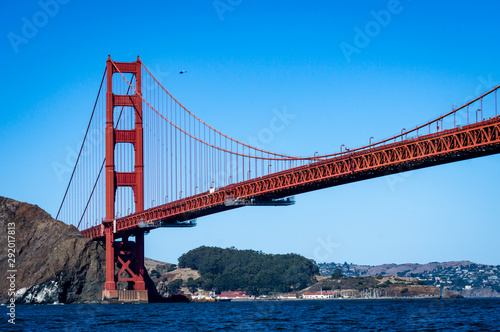 © Simon, Fototapeta premium A view of the Golden Gate Bridge towering overhead as seen from the water.