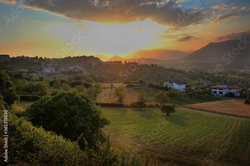Obraz premium a view of the hills and fields in Buccino, Italy during a colorful sunset.