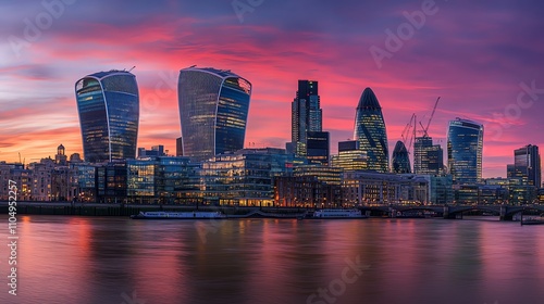 © Galib, Fototapeta premium A view of the London skyline at dusk, showcasing the River Thames and modern buildings.