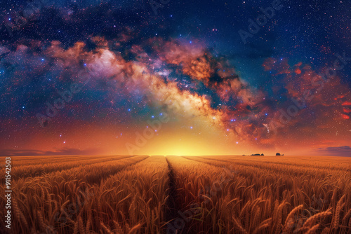 © Jacek, Fototapeta premium A view of the Milky Way over an endless wheat field.