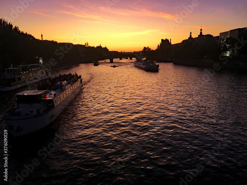 Naklejka premium A view of the river Seine in Paris in the evening showing a sunset