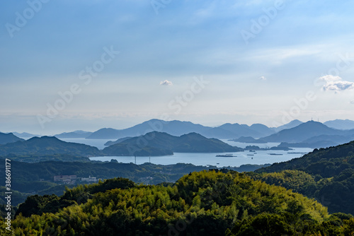 © pikumin, Fototapeta premium A view of the Seto Inland Sea as seen from mountain in Fukuyama city