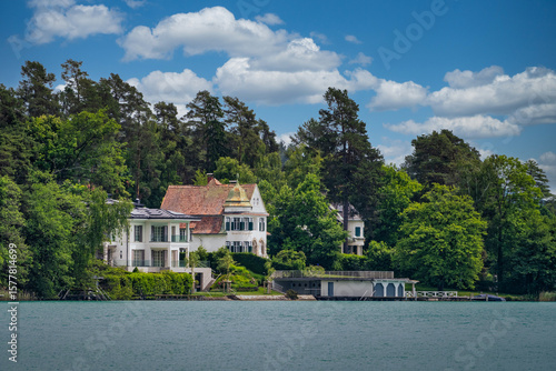Naklejka premium A view of the shoreline landscape of Maria Wörth on Lake Wöhrtersee