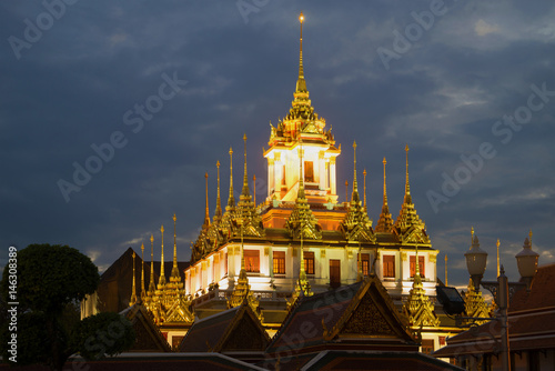 © sikaraha, Naklejka premium A view of the top of Chedi Loha Prasat (Metal Palace) of the Buddhist temple of Wat Ratchanadda in the evening twilight. Bangkok, Thailand