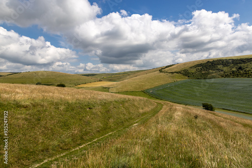 © lemanieh, Fototapeta premium A view over agricultural fields in the South Downs, on a sunny summer's day