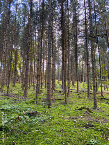 © Wolfgang Hauke, Fototapeta premium A view through the forest trees with a moss ground and the sun rays peak through the trees