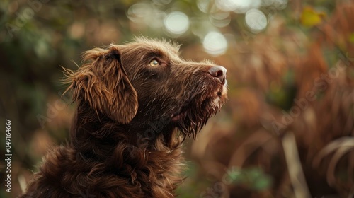 © AkuAku, Fototapeta premium A vigilant brown furry dog