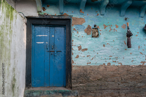 © Akhilesh, Naklejka premium A village house made of mud and stone with wooden doors.