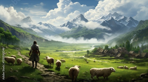 © Rabia Stocks, Naklejka premium A village shepherd walks along a dirt path, guiding a flock of sheep through rolling green pastures as a loyal sheepdog keeps them in line. The distant mountains frame the idyllic scene.