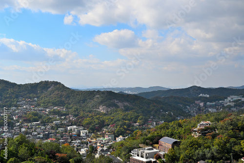 © QyuKim, Obraz premium A village under a mountain in autumn under a rather cloudy blue sky