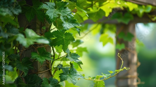 © Anna, Obraz premium a vine is growing on the side of a wooden structure with green leaves growing on the side of the structure.
