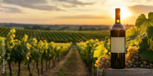 Fototapeta premium A vineyard at sunset with grapevines stretching into the horizon, wine bottle...