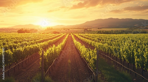 Fototapeta premium A vineyard at sunset, with long rows of vines reaching into the distance, symbolizing abundance and the art of winemaking