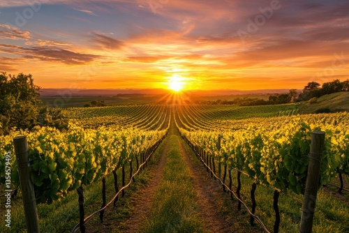 Naklejka premium A vineyard at sunset with rows of grapevines and a vibrant sky filled with...