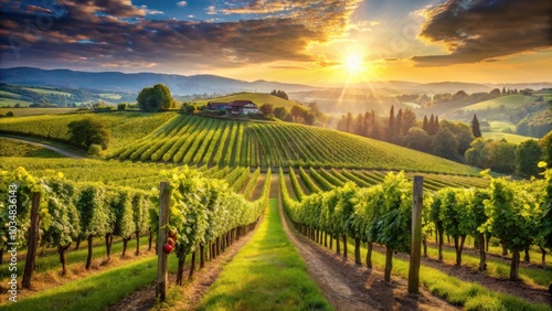 Naklejka premium A vineyard basks in the warm glow of a golden sunset, with rolling hills and...