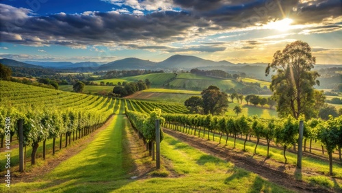 Naklejka premium A vineyard bathed in the golden light of a setting sun, casting long shadows across the rows of grapevines and illuminating the distant hills
