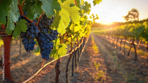 © Soknea, Fototapeta premium A vineyard filled with Concord grapevines at sunrise, showcasing the lush greenery and hanging grape clusters