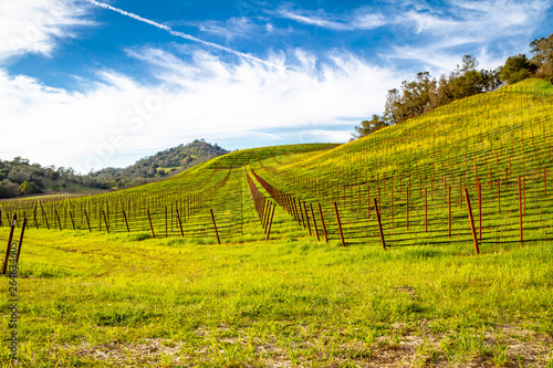 Fototapeta premium A vineyard in Napa Valley, California on a hillside looking down rows of vines.