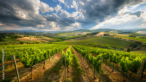 © Finn, Fototapeta premium A vineyard in Tuscany Italy with rolling hills and rows of grapevines.