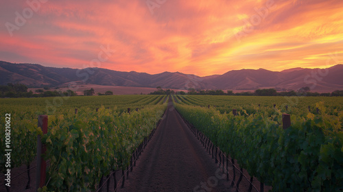 Fototapeta premium A vineyard landscape at sunset, with rows of grapevines heavy with ripe grapes