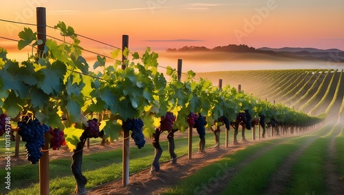 Fototapeta premium A vineyard landscape at sunset, with rows of grapevines stretching into the distance, lush with ripe grapes ready for harvest.