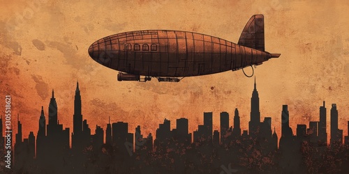 © Npicture, Naklejka premium A vintage airship flies above a city skyline at dusk