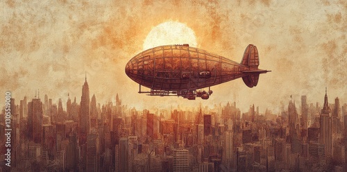 Naklejka premium A vintage airship flies over a sprawling metropolitan city landscape