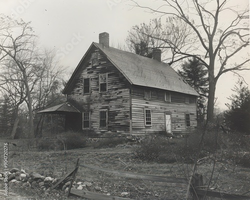 Obraz premium A vintage black and white photo of an aged, weathered house surrounded by...