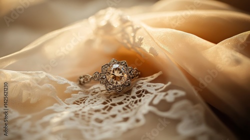 © Sirichat. Camphol, Obraz premium A vintage diamond brooch placed on a lace fabric, evoking a sense of antique style,