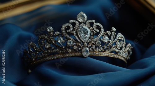 Fototapeta premium A vintage diamond tiara with intricate metalwork resting on a royal blue fabric