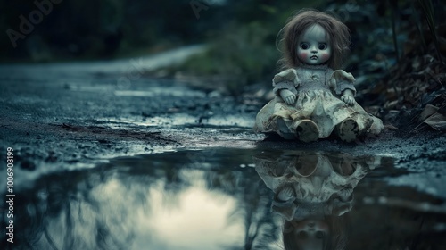 © kept, Obraz premium A vintage doll sitting alone by a puddle on a dark, moody road.